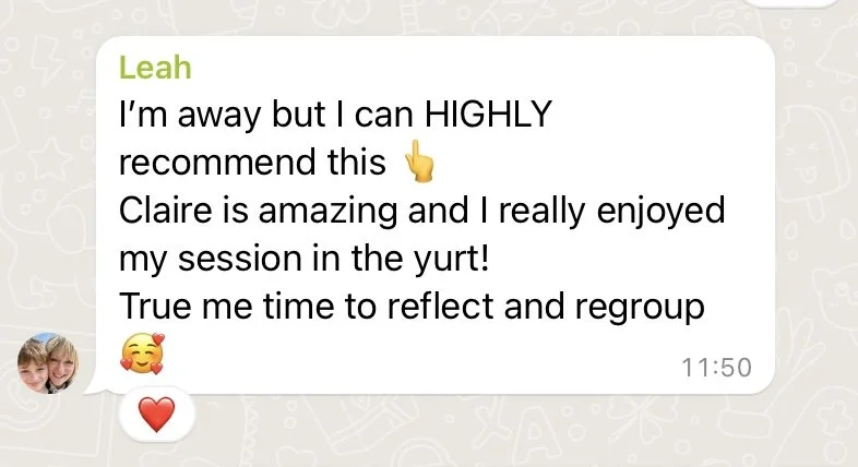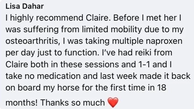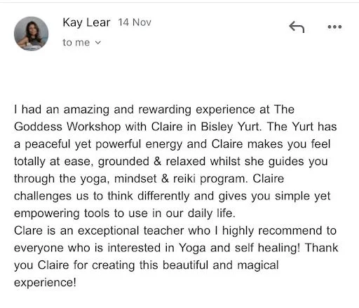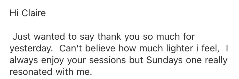 “Wow! I’ve just done an online wellness course with Claire for connecting mind, body and spirit and it was amazing. Having just had a baby it’s been hard to dedicate time to self-care and this was a special session that helped me to reconnect with self. Claire expresses her journey and beliefs so passionately you are immediately drawn in and feel relaxed. The exercises and meditations were intuitive and calming and the highlight was the Reiki session at the end which was mind-blowing.